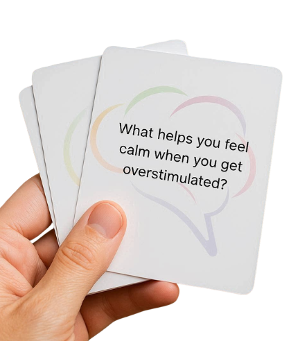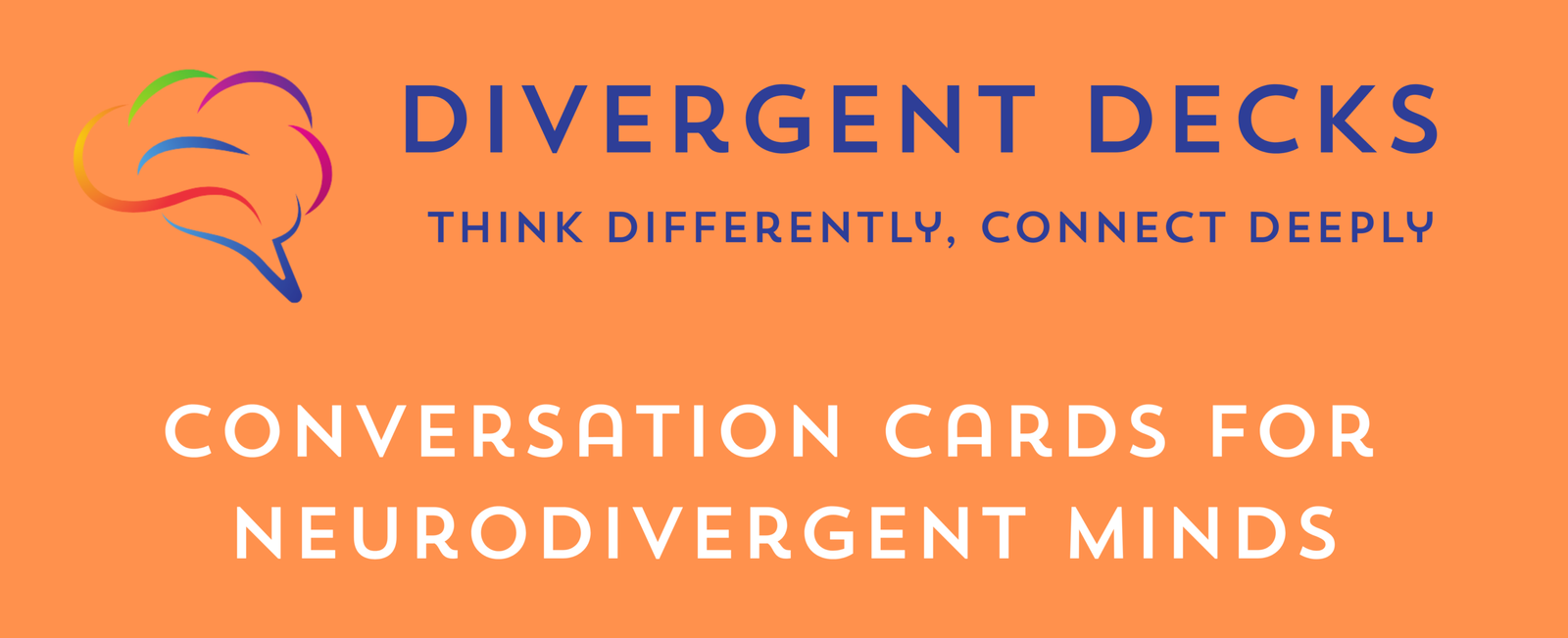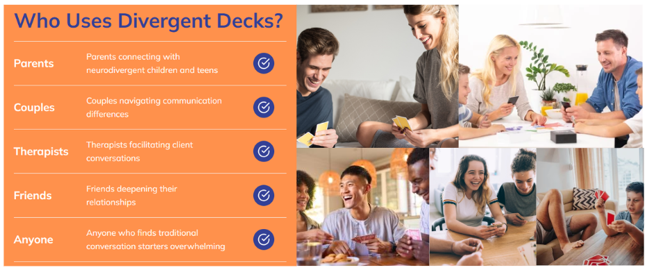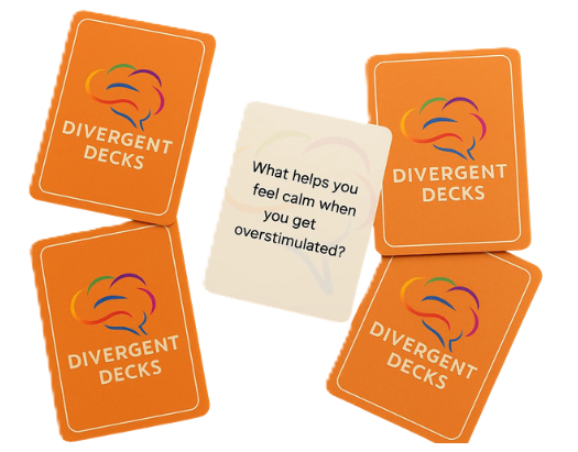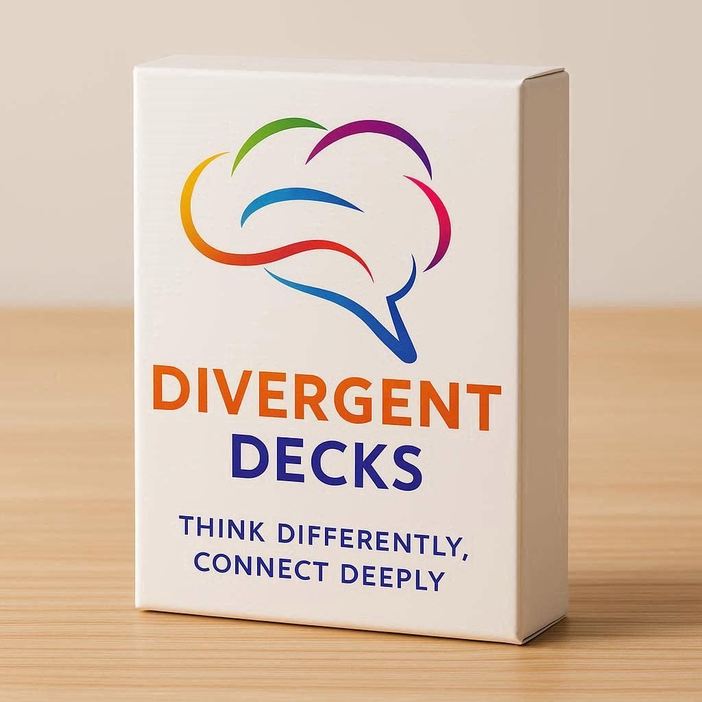 Divergent Decks exists to transform communication for neurodivergent individuals and their loved ones. We recognize that traditional conversation advice “just talk,” “be spontaneous,” “read between the lines” doesn’t work for minds that process information differently. Through thoughtfully designed conversation cards, we provide the clear, concrete questions that neurodivergent brains need to express themselves authentically, understand others deeply, and build meaningful connections. Our tools replace ambiguity with clarity, reduce social anxiety with structure, and honor neurodivergent communication styles while bridging understanding across all neurotypes. Everyone deserves relationships where they can think differently AND connect deeply without having to change who they are.